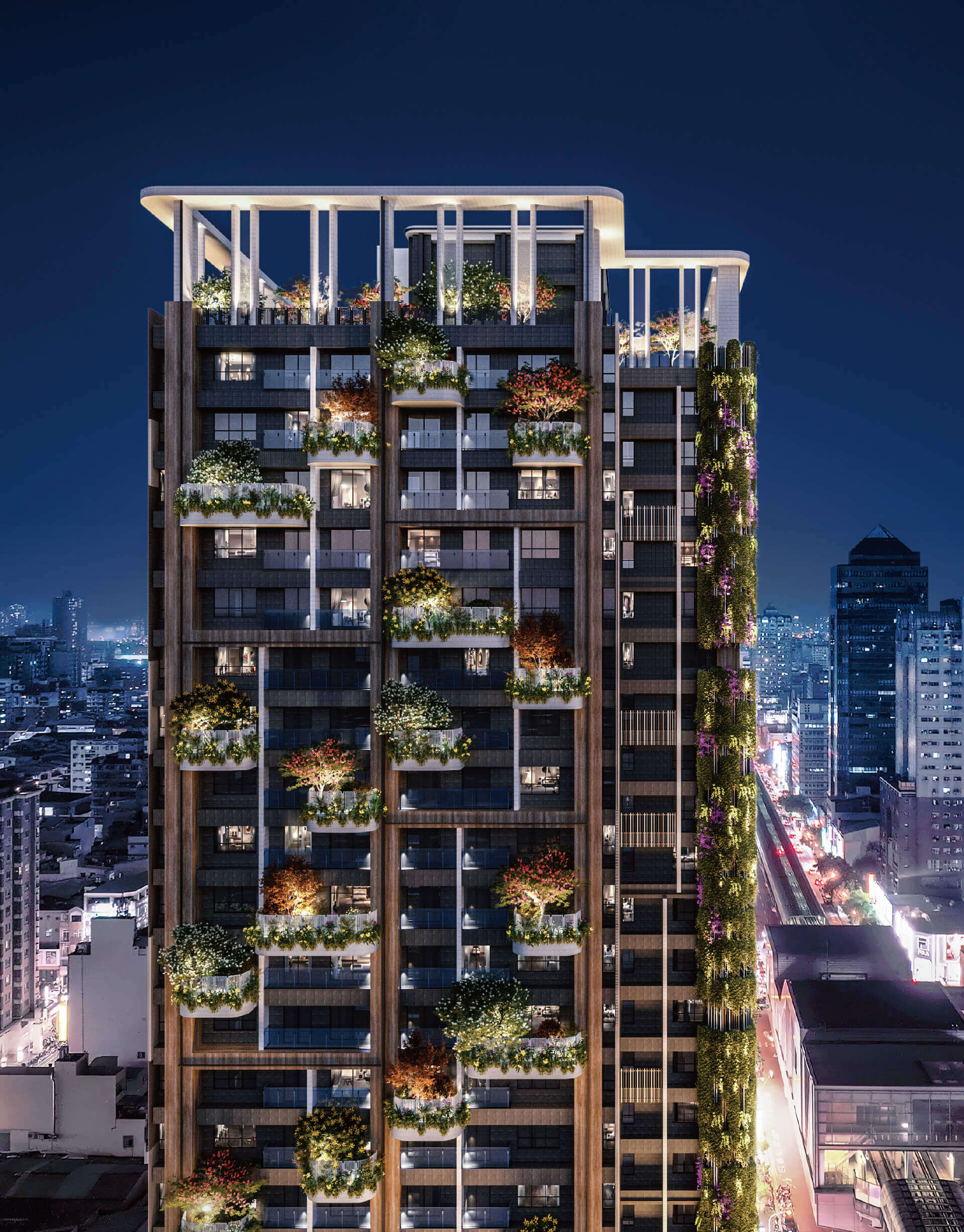 條條垂直樑柱,繪寫令人敬畏的巨木群,巧妙擬仿大樹向上竄升的巍峨姿態;春夏秋冬、四季變化,婀娜展現在錯層陽台之上。是雲霧、又是樹梢,營造輕盈漂浮的四季垂直花園。山壁與綠瀑一傾而下,與光影共舞融入都會之中,讓建築與森活,形成循環、永續且自成一格的生物氣候學。